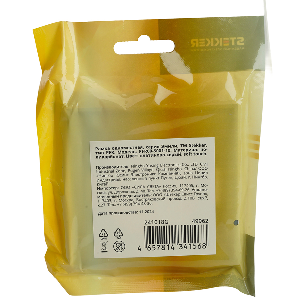 Производитель STEKKER Полное наименование Рамка 1-я Платиново-серый Эмили Код производителя (Артикул) 49962 Серия Эмили Код Просвет 013969 Высота изделия 9,4 Единица измерения шт Высота Упаковки, мм 15 Длина Упаковки, мм 108 Цвет платиново-серый, soft touch -