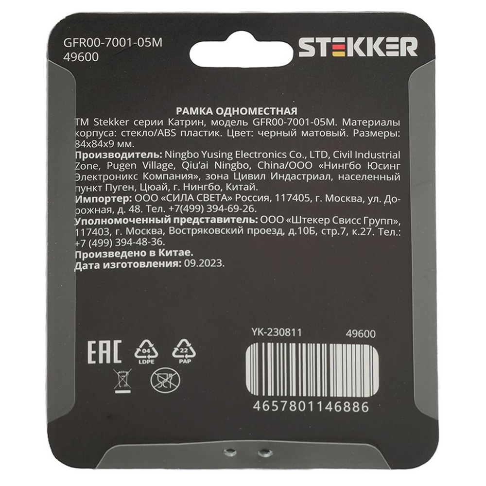 Производитель STEKKER Полное наименование Рамка 1-я стекло Черный матовый Катрин Код производителя (Артикул) 49600 Серия Катрин Код Просвет 015994 Высота изделия 9 Единица измерения шт Высота Упаковки, мм 10 Длина Упаковки, мм 125 Ширина Упаковки, мм 105 Цвет Черный матовый -