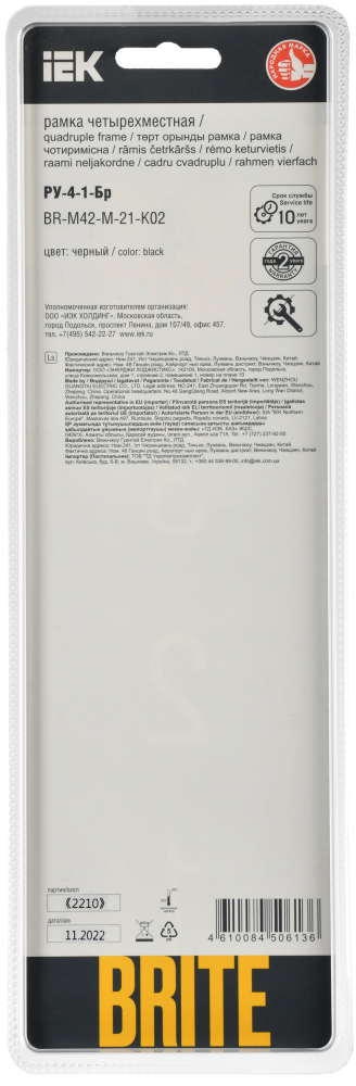 Производитель IEK (ИЭК) Полное наименование Рамка 4-я Металл Черный RE AL Brite Код производителя (Артикул) BR-M42-M-21-K02 Серия Brite Код Просвет 021971 Количество постов (мест) 4.0 Материал Металл Подходит для установки в кабель-канал Нет Прозрачный Нет С откидной крышкой Нет Степень защиты (IP) IP20 Тип поверхности Матовый (-ая) Высота, мм 94.0 Цвет Черный -
