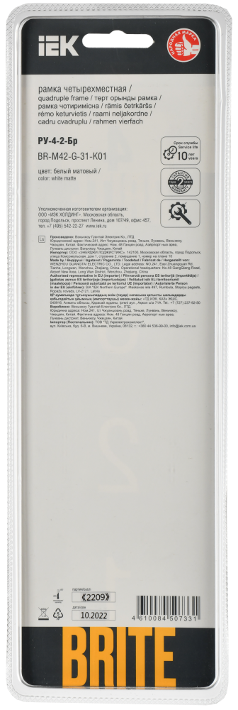 Производитель IEK (ИЭК) Полное наименование Рамка 4-я Стекло Белый матовый Brite Код производителя (Артикул) BR-M42-G-31-K01 Серия Brite Код Просвет 021955 Глубина, мм 10.3 Количество постов (мест) 4.0 Материал Стекло Подходит для установки в кабель-канал Нет Прозрачный Нет С откидной крышкой Нет Степень защиты (IP) IP20 Тип поверхности Матовый (-ая) Высота, мм 88 Цвет Белый -