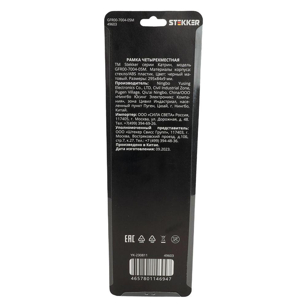 Производитель STEKKER Полное наименование Рамка 4-я стекло Черный матовый Катрин Код производителя (Артикул) 49603 Серия Катрин Код Просвет 016439 Высота изделия 9 Единица измерения шт Высота Упаковки, мм 10 Длина Упаковки, мм 340 Ширина Упаковки, мм 105 Цвет Черный матовый -