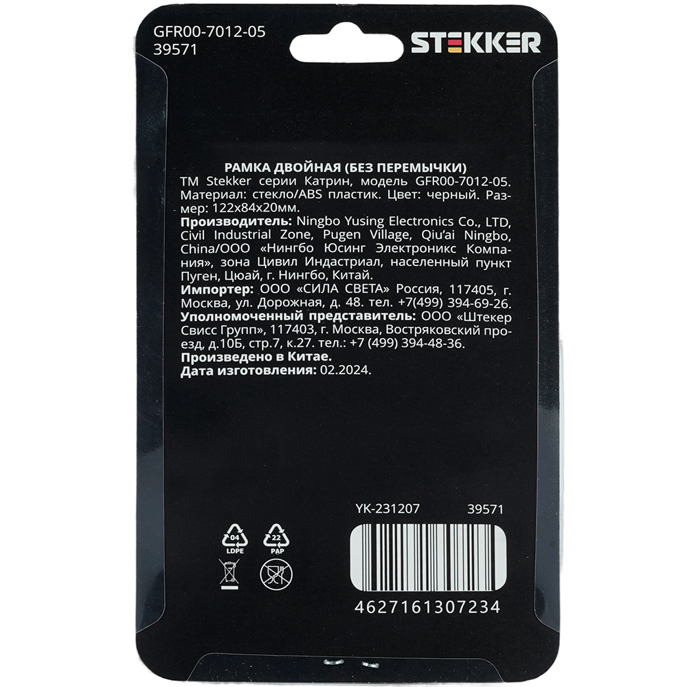 Производитель STEKKER Полное наименование Рамка 2-я без перемычки стекло Черный Катрин Код производителя (Артикул) 39571 Серия Катрин Код Просвет 014071 Высота изделия 20 Единица измерения шт Высота Упаковки, мм 20 Длина Упаковки, мм 175 Ширина Упаковки, мм 105 Цвет Черный -