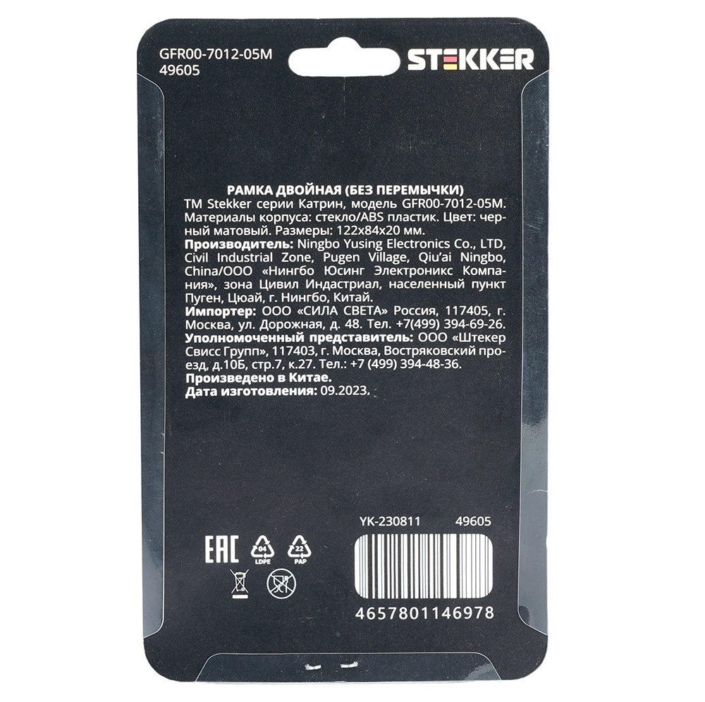 Производитель STEKKER Полное наименование Рамка 2-я без перемычки стекло Черный матовый Катрин Код производителя (Артикул) 49605 Серия Катрин Код Просвет 016827 Высота изделия 20 Единица измерения шт Высота Упаковки, мм 20 Длина Упаковки, мм 175 Ширина Упаковки, мм 105 Цвет Черный матовый -