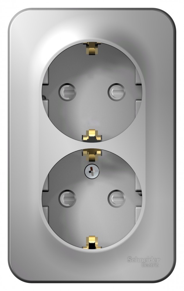 Розетка Schneider Electric BLANCA (алюминий, открытой установки) двухместная, с заземлением, шторками и изолирующей пластиной предназначена для сетей до 250В, на ток до 16А. Двухместная розетка позволяет подключить два устройства в одном месте. Шторки и заземление обеспечивают дополнительную безопасность при косвенном прикосновении.