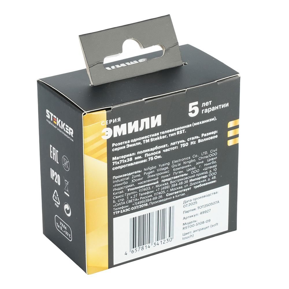 Производитель STEKKER Полное наименование Розетка TV антенна С/У Антрацит Эмили Код производителя (Артикул) 49927 Серия Эмили Код Просвет 013935 Высота изделия 38 Номин. ток - Гарантийный срок, г 5 лет Единица измерения шт Степень защиты (IP) IP20 Высота Упаковки, мм 80 Ширина Упаковки, мм 80 Цвет антрацит, soft touch -